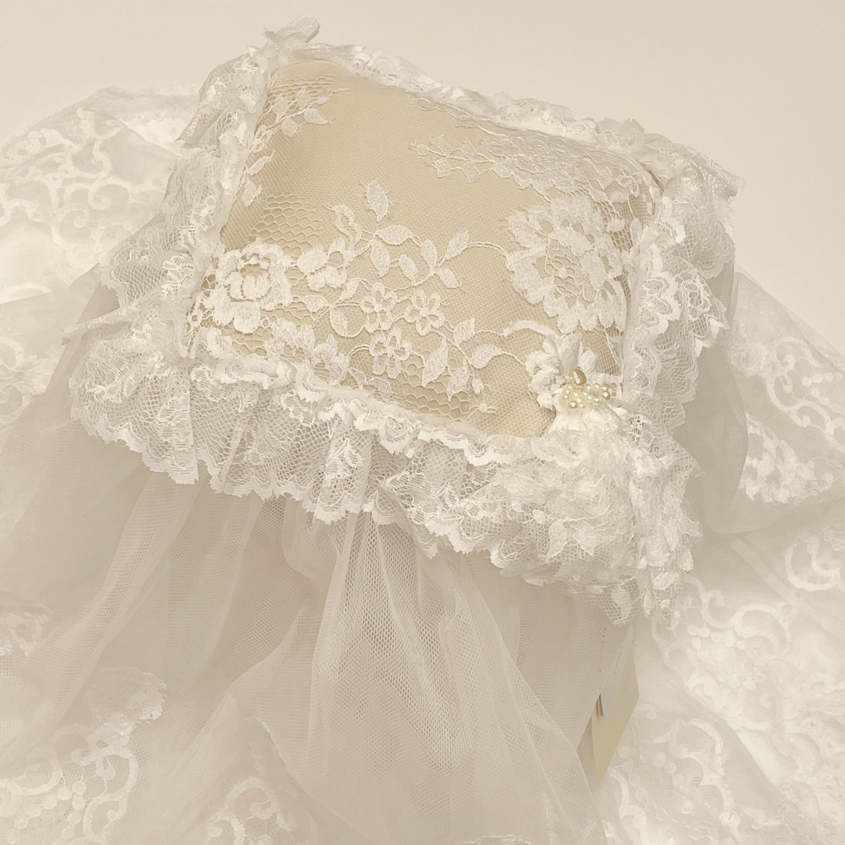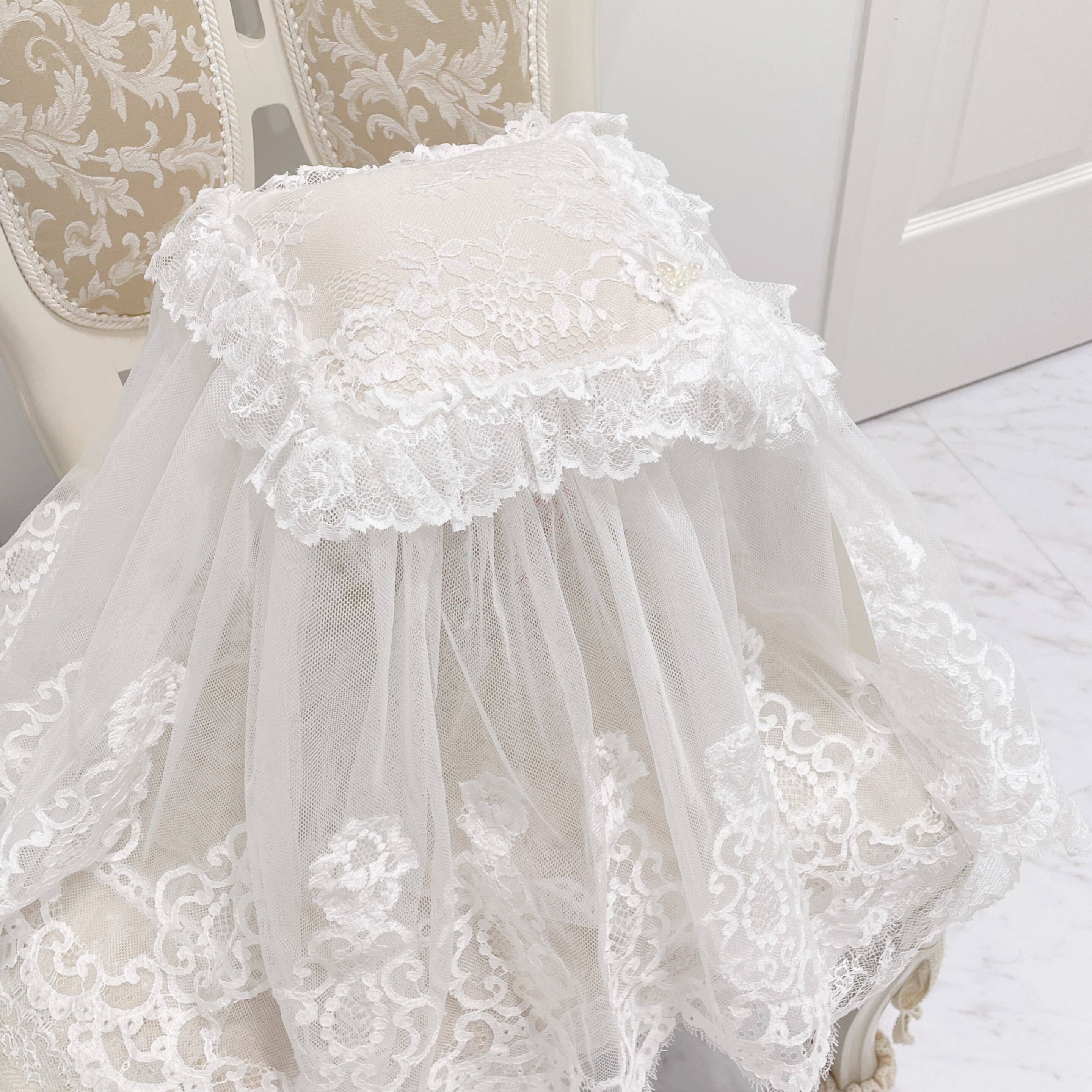 花嫁さんのヴェールのようなチュールがついたミニクッションです。